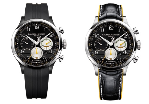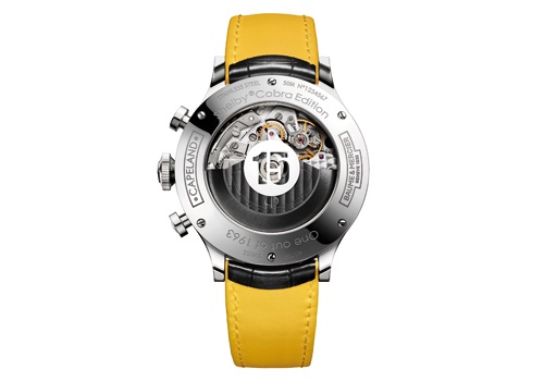Bereits im vergangenen Jahr ehrte Baume & Mercier mit der ersten Capeland Shelby® Cobra Kollektion die Visionen von Carroll Shelby. Die beiden aktuellen Linien, eine mit schwarzem Alligatorlederband und eine mit Armband aus schwarzem Kautschuk, erinnern mit gelben und grünen Akzenten sowie den zwei charakteristischen Querstreifen an die berühmte Karosserie der Cobra von damals. Beide Kollektionen sind jeweils auf 1.963 Exemplare limitiert und tragen die Ziffer 15, die Startnummer der CSX 2128, auf dem Saphirglasboden.