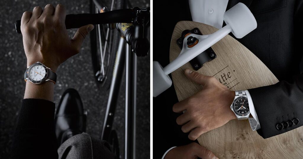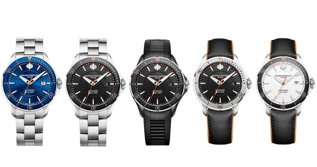 In fünf Versionen werden die neuen Clifton Club-Modelle angeboten. Zwei sind mit einem Gehäuse aus poliert-satiniertem Edelstahl sowie einem schwarzen oder weißen Zifferblatt ausgestattet. Das „all roads“-Kalbslederband sorgt für einen lässigen Look. In die Oberfläche des Bandes ist ein Muster geprägt, das an die Struktur von Segeltuch erinnert und exklusiv für Baume & Mercier gefertigt wird. Außerdem ist das Armband mit orangefarbenem gummiertem Kalbsleder unterlegt – das macht es noch widerstandsfähiger. Zwei weitere Modelle haben ebenfalls ein Gehäuse aus poliert-satiniertem Edelstahl, die Zifferblätter sind aber in Schwarz oder Blau gehalten. Für einen urbanen Look wurden diese Zeitmesser mit einem Arnband aus Stahl versehen. Das fünfte Modell zeichnet sich durch ein schwarzes Zifferblatt und ein Gehäuse aus schwarzem, mikrosandgestrahltem und ADLC-behandeltem Stahl (Amorphous diamond like carbon) aus.