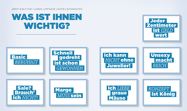 Blickpunkt Juwelier fragte Anbieter: Wie funktioniert das „Brot & Butter“-Geschäft mit Uhren erfolgreich? Die Lieferanten hatten neun Aussagen zur Auswahl. Und so haben sie sich entschieden.