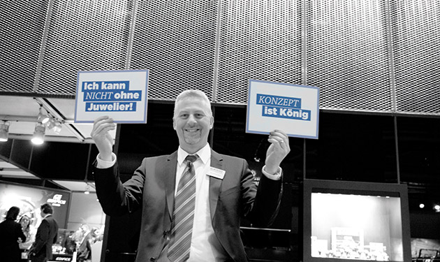 Was wäre Elysee ohne die neuen Certus-Marken? Am Beispiel der sechs Marken, die alle eine ganz klar definierte Zielgruppe ansprechen, kommt der Konzeptgedanke zum Tragen. Für jede Zielgruppe werden die passenden Produkte und das passende Konzept dazu geliefert. Julian Seume, der Juniorchef von Elysee, gibt ein klares Bekenntnis pro Juwelier ab und sucht sich dementsprechend das Schild „Ich kann nicht ohne Juwelier“ aus.