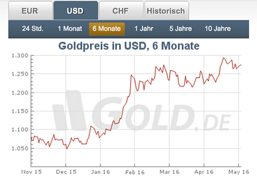 Anfang Mai erreichte der Goldpreis, erstmals seit Januar 2015, wieder die 1.300 USD-Marke. Seit Jahresbeginn ist das ein Plus von rund 20 %. Geschult ist diese Entwicklung einer Kombination der niedrigen Zinsen in den Industrienationen und dem schwächelnden Dollar. Von der stärkeren Nachfrage profitieren u.a. börsengehandelte Goldfonds, aber auch die physische Ware: Die amerikanische Münzanstalt hat im April 105,5 Tausend Unzen Goldmünzen verkauft. Das sind dreieinhalbmal so viele wie im Vorjahr, ermittelten die Analysten der Commerzbank.