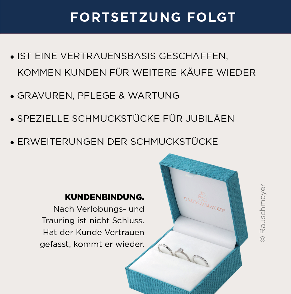 Für den stationären Schmuckfachhandel ist der Verlobungsring damit ein zentraler Einstiegspunkt in die Kundenbeziehung. In den meisten Fällen sind es Männer, die erstmals ein Fachgeschäft betreten und vor einer beratungsintensiven Entscheidung stehen. Wer in dieser frühen Phase präsent ist, strukturiert berät und Kompetenz vermittelt, wird als vertrauenswürdige Adresse wahrgenommen. Gleichzeitig entsteht hier die Grundlage dafür, den Kunden über den Antragstag hinaus dauerhaft an das eigene Geschäft zu binden.