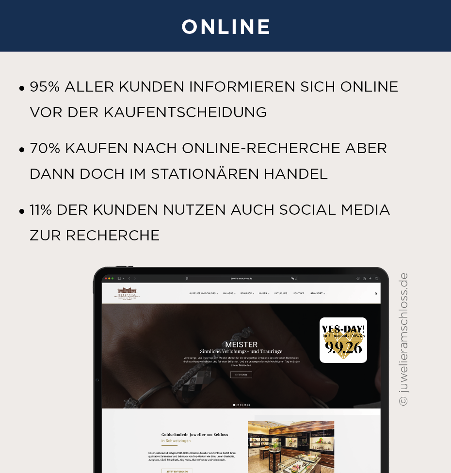 Der YES-DAY! markiert den Antragstag, nicht den Kaufzeitpunkt des Verlobungsrings. Für den stationären Schmuckfachhandel bedeutet das: Die wirtschaftlich entscheidende Phase liegt vor diesem Datum. In den Wochen und Monaten vor dem Antrag beginnen viele Männer, sich mit dem Thema Verlobungsring auseinanderzusetzen. Sie informieren sich online, vergleichen Anbieter und suchen nach Orientierung, lange bevor der Antrag konkret terminiert ist.