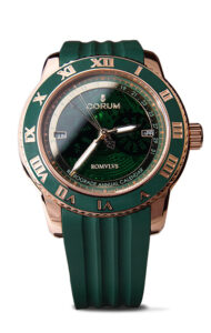 Romvlvs, die italienische Kreation von Corum kehrt zurück. Eine streng limitierte Serie mit retrogradem Kalender – daher auch der Name Romvlvs 44 Annual Calendar – wurde aufgelegt. Der Kontrast zwischen Rotgold und einem dunklen Grün macht das Modell zu einem Hingucker. Das Zifferblatt besteht aus halbtransparentem, grünem Saphirglas, abngetrieben wird die Neuauflage vom Kaliber CO502. Spannend ist die runde Datumsanzeige und die Wochentags- und Monatsanzeige. Passend zum Namen gibt es römische Ziffern auf der Lünette.
