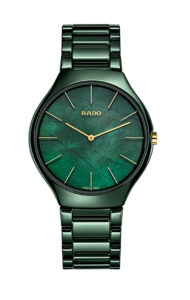 Die Schweizer Marke, die besonders für ihre Materialexpertise bekannt ist, hat sich ebenfalls dem Thema Grün verschrieben. Und zwar mit der Rado True Thinline Quartz, die mit einem expressiven, blatt-ähnlichen Zifferblatt auf sich aufmerksam macht. Das Gehäuse und Band aus grüner Hightech-Keramik machen den Natural-Look perfekt.