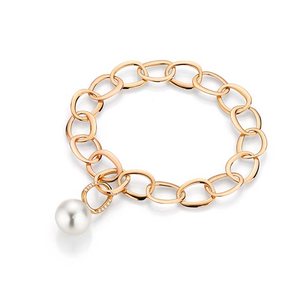 Armband aus der Linie MODERN CLASSICS. 750 Rosé Gold mit 20 Brillanten und einer weißen Südsee-Zuchtperle. Dazu der passende Ring. Ring aus der Linie MODERN CLASSICS. 750 Rosé Gold mit 27 Brillanten und einer weißen Südsee-Zuchtperle. © Gellner