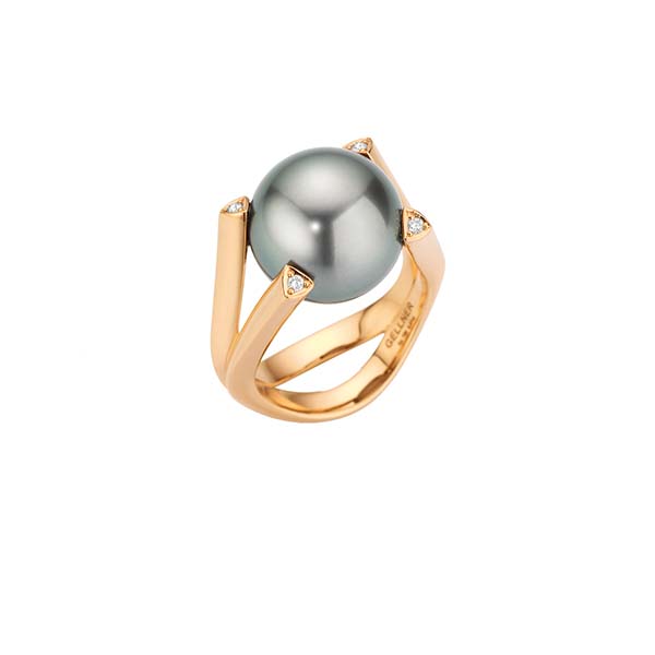 Ohrstecker aus der Linie WAVE. 750 Rosé Gold mit 10 Brillanten und 2 Marutea Zuchtperlen. Dazu der passende Ring. Ring aus der Linie WAVE. 750 Rosé Gold mit 4 Brillanten und einer Marutea Zuchtperle. © Gellner