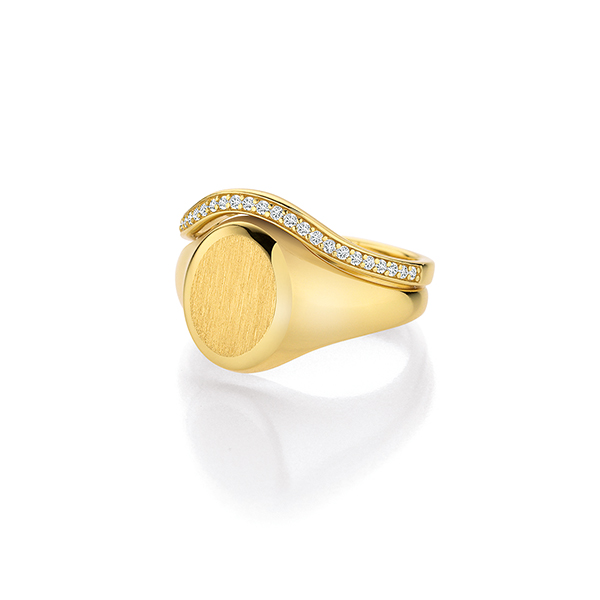 Gelbgold-Siegelring mit ovaler Platte, an den sich harmonisch ein passgenauer Vorsteckring anschmiegt. // Ein neues Ringdesign bereichert den 3D-Konfigurator von Collection Ruesch. Hier zeigt er sich mit einer markanten Baumrinden-Oberfläche, die durch polierte Schrägen besonders edel zur Geltung kommt. Im Online-Konfigurator kann dieses Profil ganz nach Wunsch individualisiert werden. © Collection Ruesch