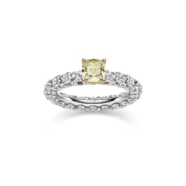 Dieser Ring ist ein einzigartiges Statement-Piece, das von einem Fancy Yellow Diamanten im Cushion-Schliff gekrönt wird. Auch hier werden die Goldelemente in einem aufwändigen Verfahren bearbeitet, das den Eindruck einer zusätzlichen Facette erschafft. Dieser Ring mit Diamant im Cushion-Schliff ist weit mehr als ein Solitaire. Durch die besondere Fasstechnik der Ultimate Linie scheint er ausschließlich aus Diamanten zu bestehen. Dadurch wirkt der Ring wie ein Band aus fließendem Licht. Das Zusammenspiel von Design und ausgewählten Diamanten bringen Exklusivität und Luxus in den Alltag.