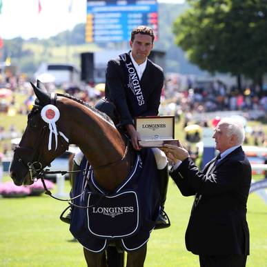 Nach einem spannenden Wettkampf gewann der Schweizer Romain Duguet den Longines Grand Prix in St. Gallen mit seiner Stute Quorida de Treho. Zusätzlich wurde er mit der „Longines Trophy“ als bester Reiter des Turniers ausgezeichnet und von Walter von Känel, Präsident von Longines, mit einer edlen Uhr der Marke geehrt.