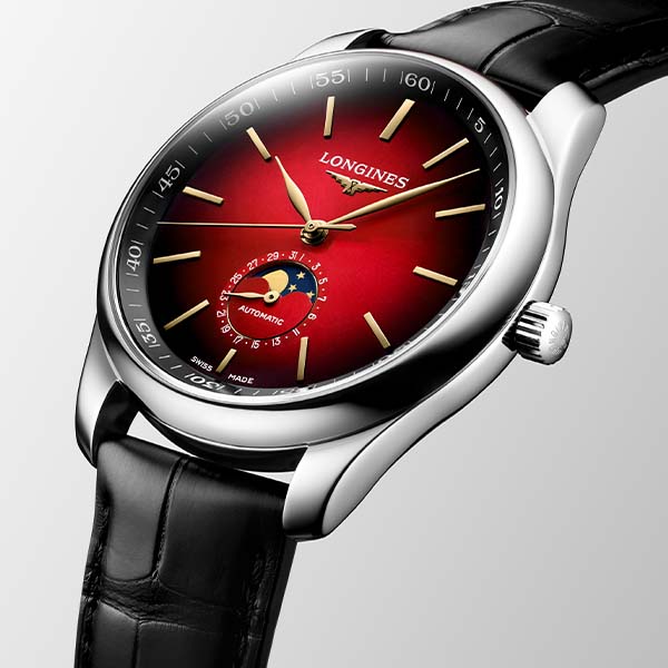 Technisch basiert das Modell auf dem Automatikwerk L899.5, ausgestattet mit Siliziumspiralfeder und einer Gangreserve von bis zu 72 Stunden. Das 42 Millimeter Edelstahlgehäuse wird durch ein rotes Zifferblatt mit Sonnenschliff und dezentem Farbverlauf ergänzt. Vergoldete Zeiger, applizierte Indizes sowie eine Mondphasenanzeige mit Datumsring unterstreichen den Anspruch der Master Collection. Der transparente Gehäuseboden erlaubt den Blick auf den gravierten Rotor, der Kunst und Mechanik miteinander verbindet.