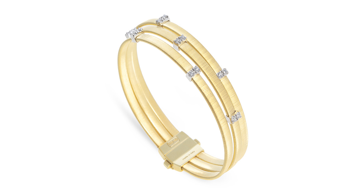 Bekannt für sorgfältige Handarbeit, genießt Marco Bicego internationales Renommee als Schmuckmarke “Made in Italy”. Die Schmuckstücke der Schmiede sind aus 750er Gold gefertigt und werden mit ausgewählten Edelsteinen veredelt. Alle Preziosen werden von Hand nach der traditionellen Bulino-Gravurtechnik und der charakteristischen “Corda-di-Chitarra”-Technik gearbeitet, bei der die filigrane Wicklung des Goldfadens an eine handgefertigte Gitarrensaite erinnert.