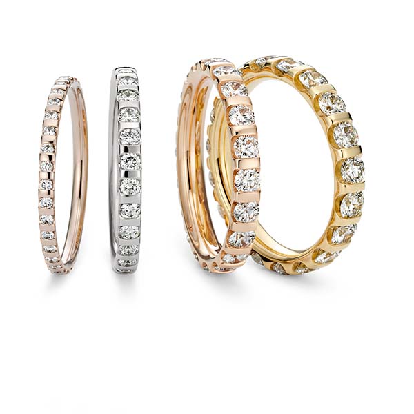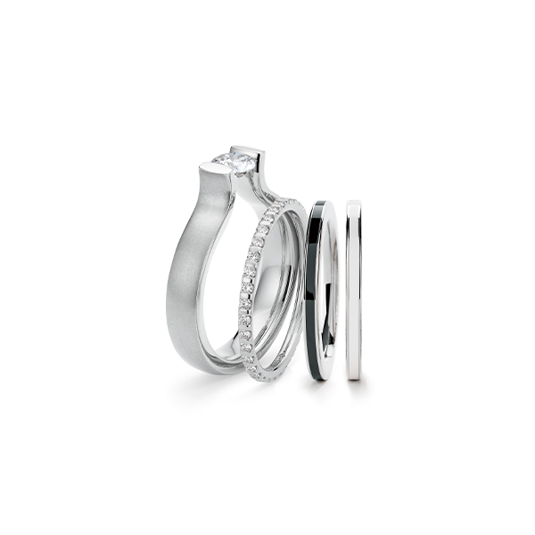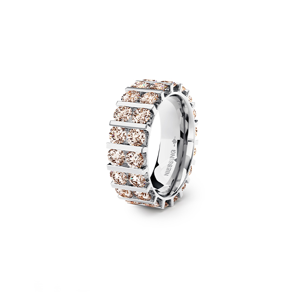 Niessing Memory HighEnd Duo: ein moderner Memoire-Ring mit fast schwebenden Brillanten – gefertigt aus einem einzigen Edelmetallbarren und von Hand gefasst. © Niessing