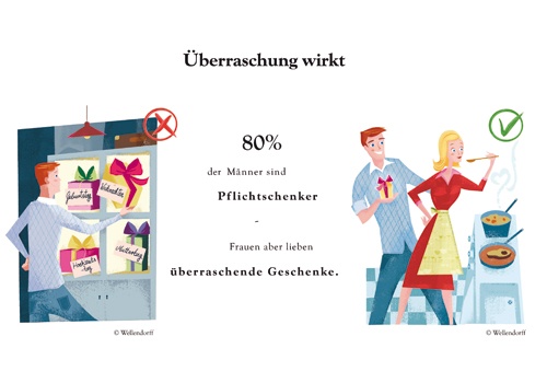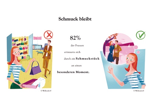 Nicht einmal ein Fünftel der Frauen konnte sich bei Mode, Taschen, Smartphones oder Accessoires an den Anlass des Schenkens erinnern – bei Schmuck allerdings schon! Hier blieb dieser Moment 82 Prozent der Frauen im Gedächnis. Für sie zählt der Augenblick der Freude, denn der Transport von Gefühlen wiegt mehr als die Übergabe des gekauften Artikels. Im Beratungsgespräch kann der Juwelier verdeutlichen, dass ein Schmuckstück die Liebste auf allen Ebenen ansprechen wird und die emotionale Erinnerung schaffen kann.