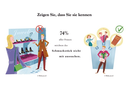 Die meisten Frauen möchten den Schmuck nicht mit aussuchen. Sie schätzen es, wenn ihr Partner sie so gut kennt, um ihren Geschmack zu treffen, oder sich zuvor bei Freunden und Verwandten kleine Anregungen geholt hat. Der Juwelier kann den Mann mit gezielten Fragen bei der Suche nach dem perfekten Geschenk unterstützen. Denn dieser denkt vielleicht gar nicht daran, welche Farben, Stile oder Legierungen seine Frau bevorzugt. Gemeinsam mit dem Juwelier kann das Geschenk gefunden werden, das sie glücklich macht