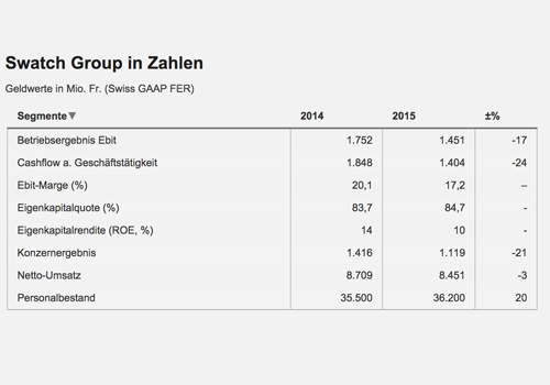 Der Nettoumsatz der Swatch Group lag mit 8,45 Mrd. Franken zu konstanten Wechselkursen um -0,9 Prozent unter dem Vorjahreswert, zu aktuellen Wechselkursen waren es -3 Prozent. Der Betriebsgewinn sank um -17 Prozent, der Konzerngewinn sank um -21 Prozent auf 1,1 Mrd. Franken.