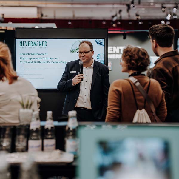 Die Ebenen Business und Vertrieb sowie Community und Partnerschaft rundeten die Messewelt ab. Neben neuen internationalen Kontakten und Gesprächen konnten auch weitere Partner im DACH-Raum dazugewonnen werden. In vielen Gesprächen mit Besuchern wurde die SCS-007-Zertifizierung als Gesprächspunkt rund um transparente Branchen-Standards in den Fokus gerückt und führte zu vielen Neuanmeldungen für die exklusiven Nevermined Laborführungen am Standort Essen. Besonders auffällig war außerdem das Interesse junger Designer an der Alternative von lab-grown Diamanten aus wirklich nachhaltiger Produktion in Deutschland. Der erstmalig angebotene Direktverkauf von Nevermined lab-grown Diamanten und mandana Armbändern wurde stark nachgefragt und somit gern angenommen, genau wie die Goodie Bags, das Gewinnspiel um einen 1 ct Nevermined lab-grown Diamanten und begleitende Social-Media-Präsenz für Bestandskunden und interessierte Besucher.