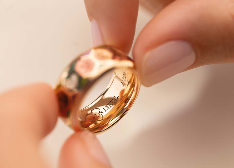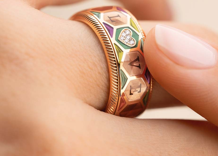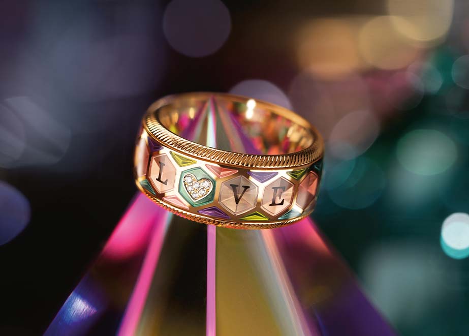 Besonders eindrucksvoll ist das neu entwickelte Wabenmuster, das die Oberfläche des Rings prägt. Auf den ersten Blick wirkt es schlicht, doch bei genauerer Betrachtung entstehen durch unterschiedlich tiefe Gravuren und gezielte Lichtbrechung dreidimensionale Facetten, die sich wie eine hexagonale Pyramide zur Mitte hin verdichten. Diese Bewegung macht den Ring zu einem optischen Erlebnis, das sich mit jeder Drehung verändert. Geometrisch steht das Sechseck für Stärke, Beständigkeit und Vollkommenheit; emotional symbolisieren die verschieden eingefärbten Hexagone die vielen Facetten der Liebe.