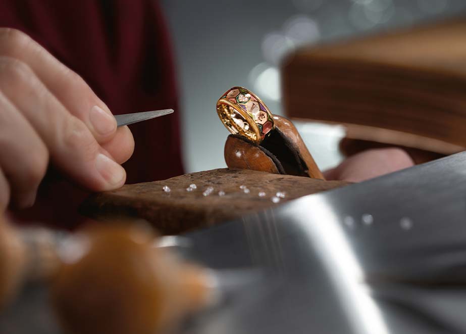 Im Untergrund ist der Schriftzug „LOVE“ in hauchdünner schwarzer Kaltemaille verewigt, wobei das „O“ durch das funkelnde Pavéherz ersetzt wurde. Auf der Innenseite hält die Gravur „AUS LIEBE“ das Bekenntnis der Manufaktur fest. Die neue Farbpalette umfasst acht Kaltemaillefarben, von Petrol bis Violett, inspiriert vom Retrochic der 1970er- und 1980er-Jahre. Ihre sanfte Transparenz verleiht dem Ring Modernität und zeitlose Eleganz zugleich. Abschließend rahmen zwei markante Kordelränder den Farbring ein, ein Wellendorff-Signature-Element, das mit mikroskopischer Präzision in das massive Gold geschnitten wird.