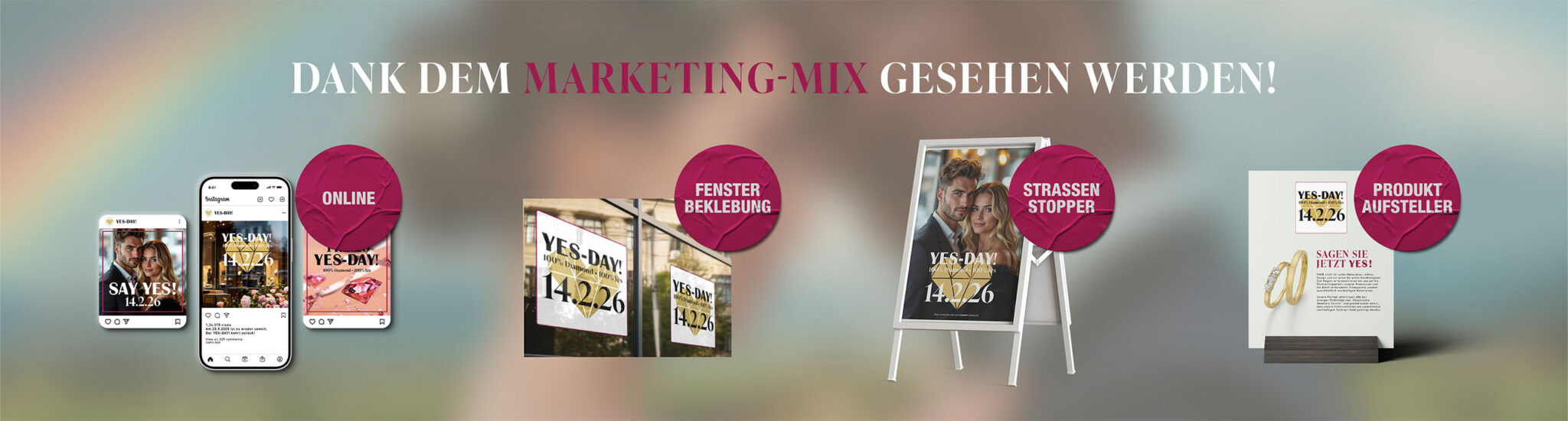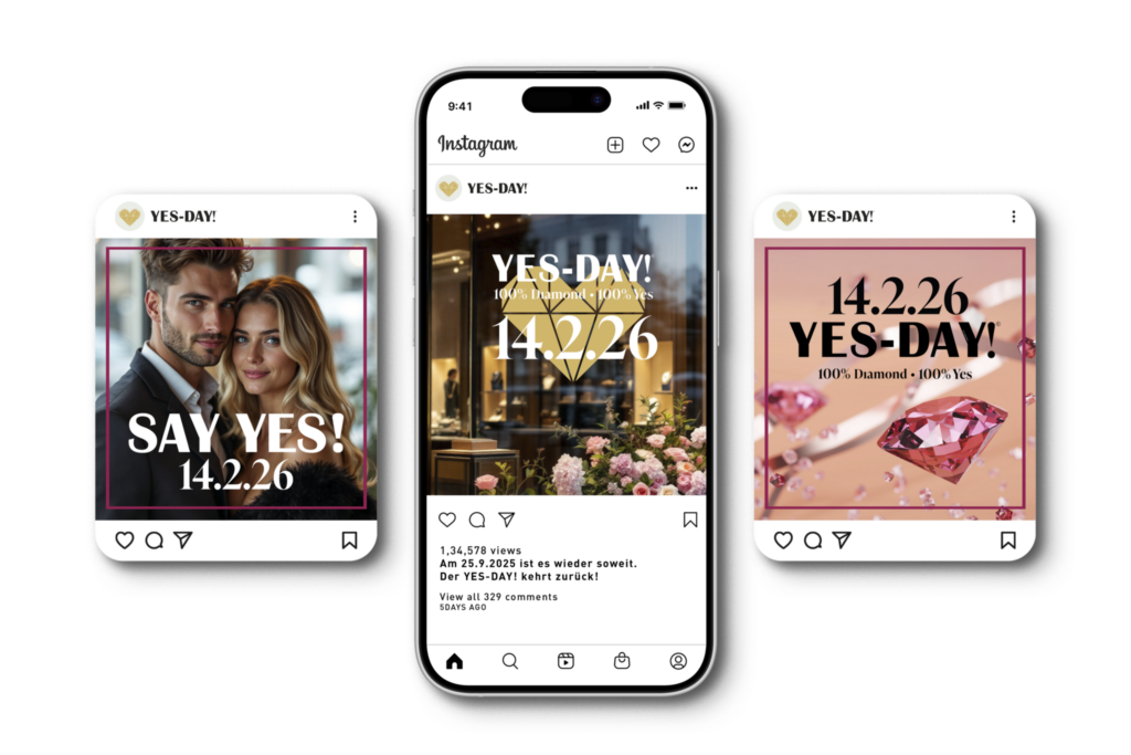 Der YES-MONTH!, also die Wochen im Dezember und Januar, bündelt diese Nachfrage. Er ist die Phase, in der Männer die Kaufentscheidung treffen, damit der Antrag pünktlich zum YES-DAY! gelingt. Der YES-DAY! findet am Valentinstag, dem 14. Februar, statt – ein Datum, das wie kein anderes für Romantik und den Moment des „Ja“ steht. Der Antragstag selbst ist kein Kauftag, sondern das Ziel. Der Umsatz passiert im Vorfeld.